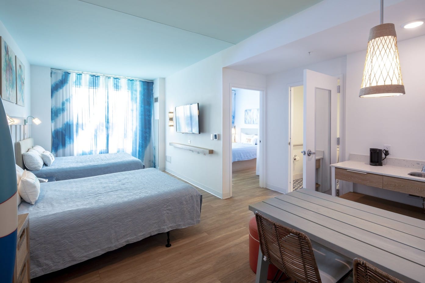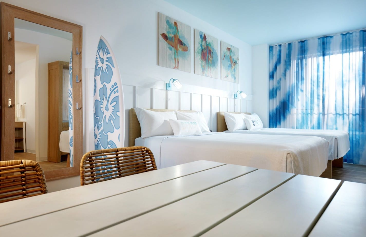 Universal’s Endless Summer Resort – Surfside Inn and Suites offers standard rooms around 313 sq ft with two queen beds and two-bedroom suites around 440 sq ft that sleep up to six.